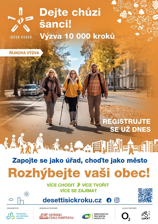 Naše město se zapojilo do říjnové výzvy 10 000 kroků, která je naprosto pro všechny. Motivuje k pravidelnému pohybu, kterým přispíváme ke zdraví naší obce. Registrujte se na www.desettisickroku.cz/ a soutěžte za nás.