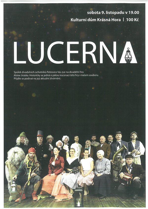 Srdečně Vás zveme na představení divadelní hry LUCERNA v sobotu 9.11.2024 od 19 hodin v Kulturním domě v Krásné Hoře nad Vltavou, vstupné 100,- Kč.