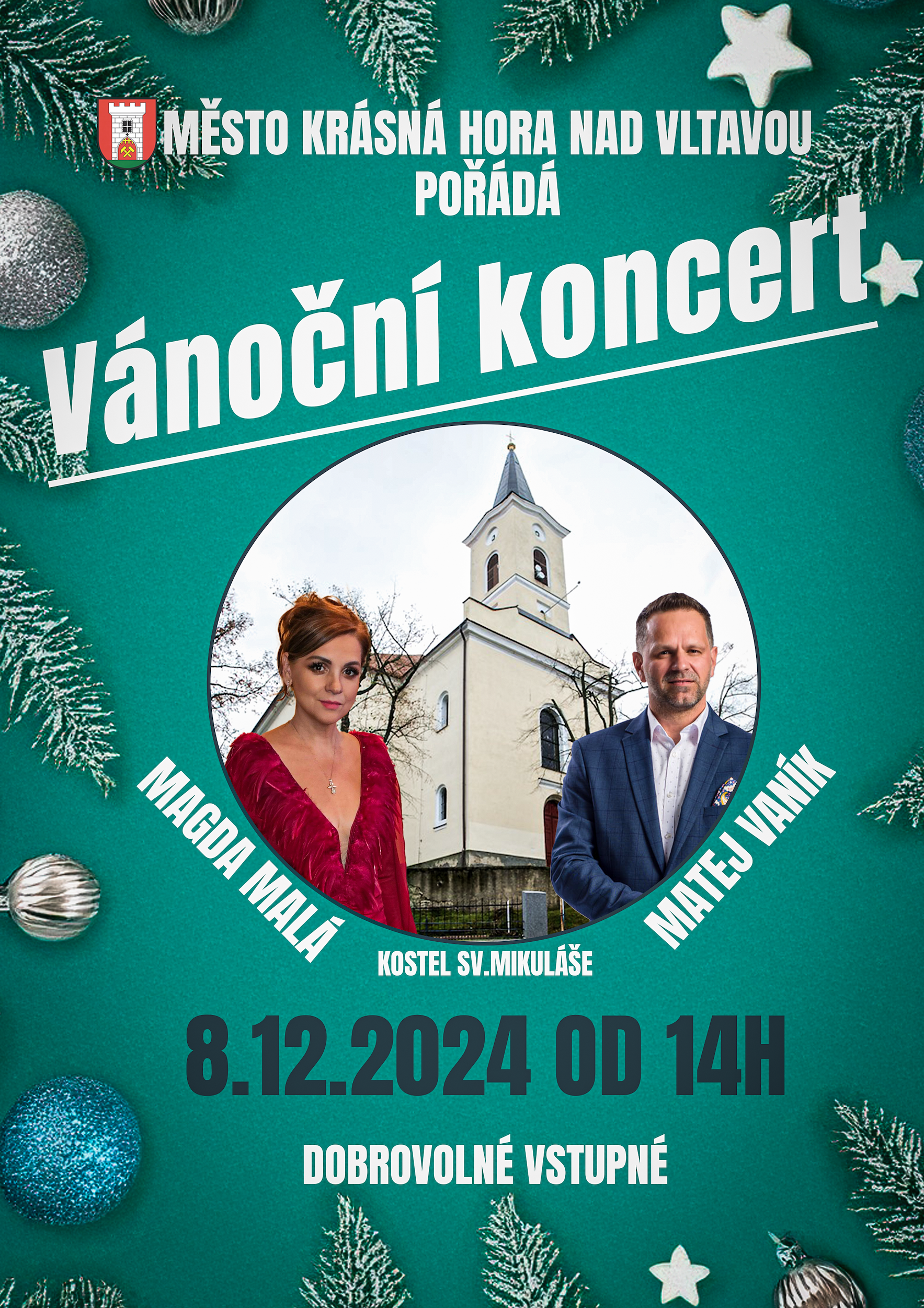 Městský úřad zve na Vánoční koncert dne 8.12.2024 (neděle) od 14,00 hod. v kostele sv. Mikuláše v Krásné Hoře nad Vltavou. Těší se na vás česká muzikálová zpěvačka populární hudby a herečka Magda Malá a Matěj Vaník, zpěvák tria La Gioia jeho autor a skladatel.
